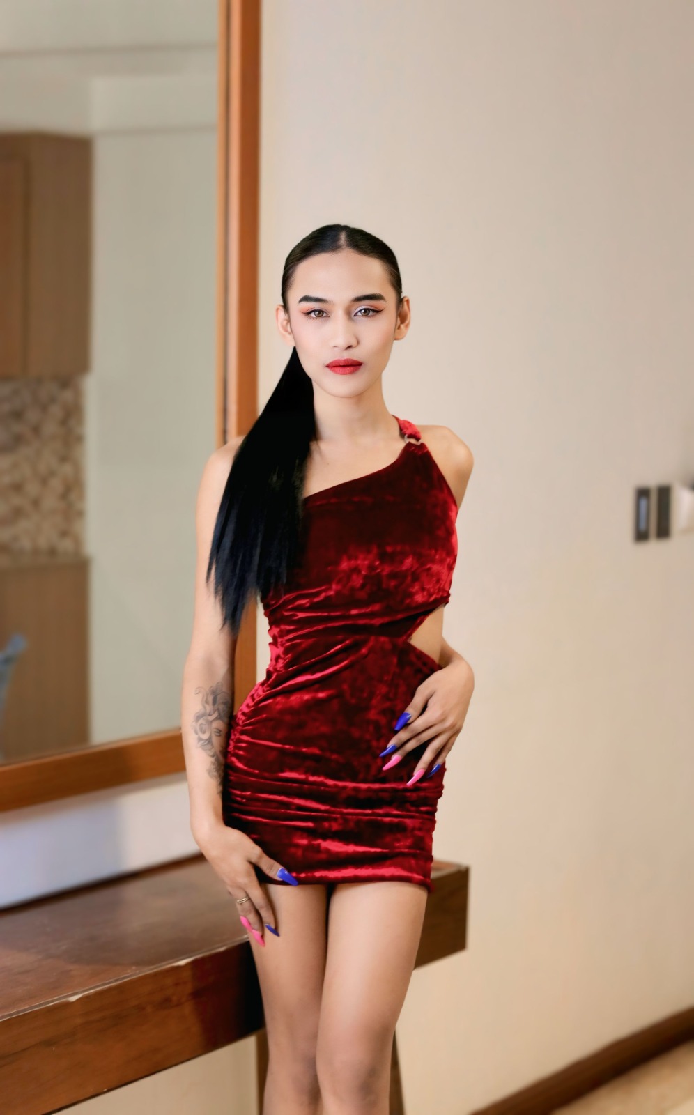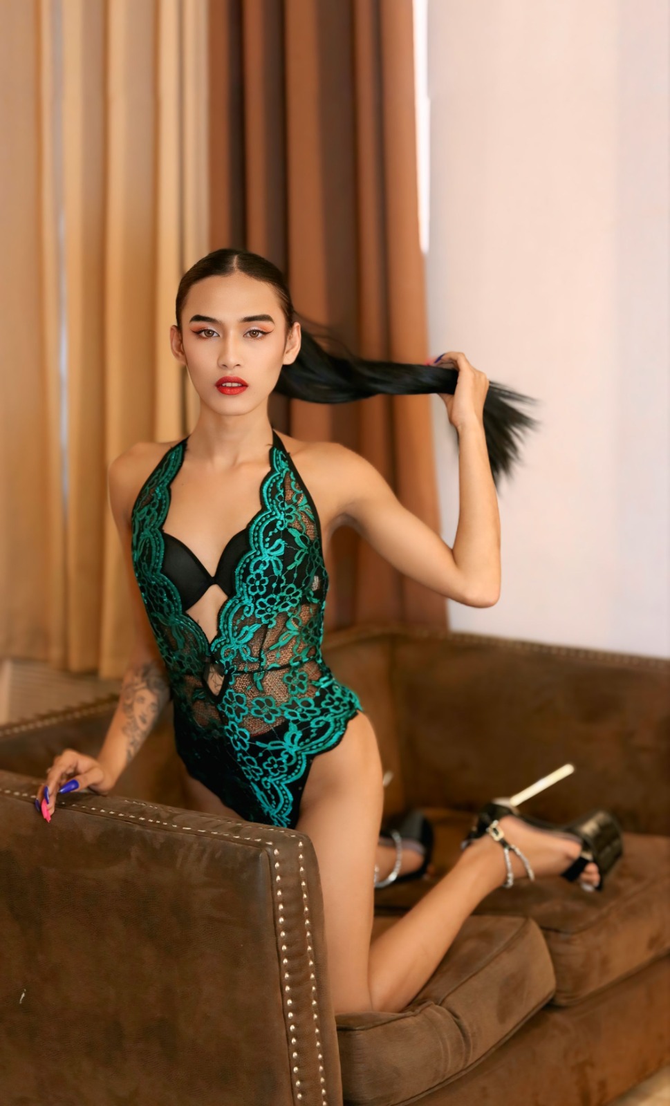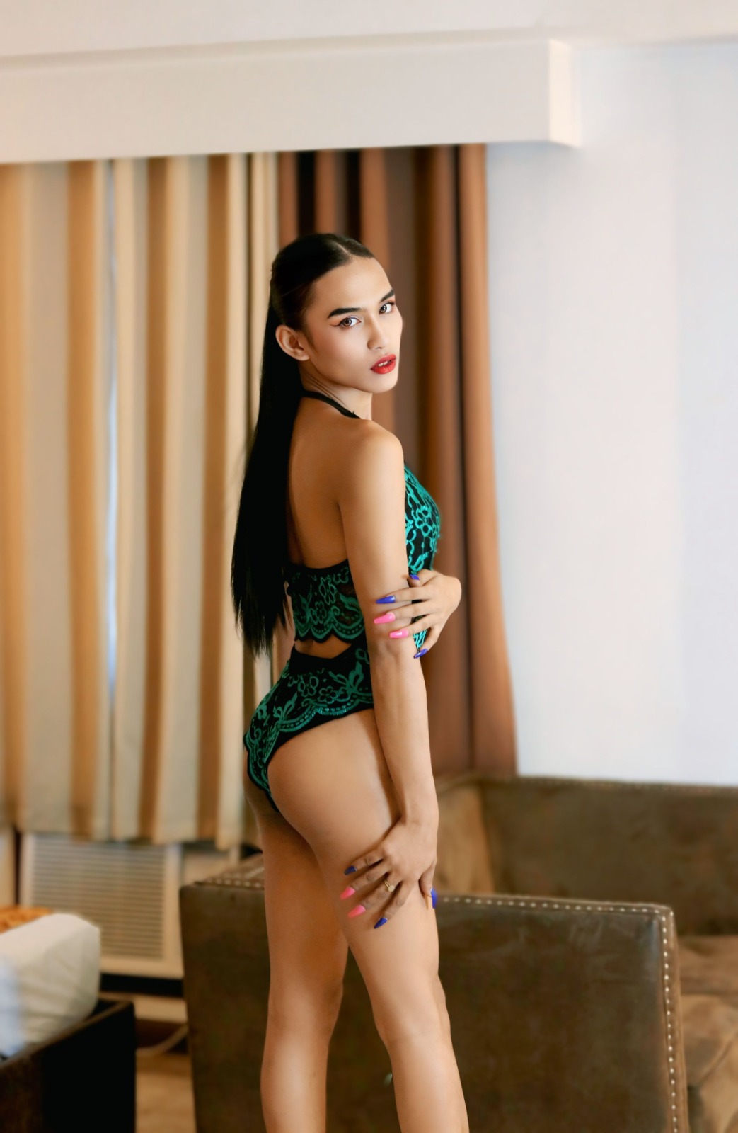 Meet Shakira, a 19-year-old Filipina trans woman from Quezon City, whose athletic 34A-25-34 figure and radiant tan complexion exude confidence and charm. Standing at 5’6” and weighing 88kg, her toned physique reflects her active lifestyle, accentuated by a belly piercing that adds a playful edge.